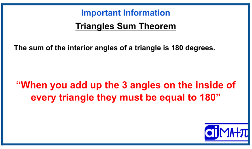 There are 3 ways to describe a triangle when you are referring to the interior/inside of the shape. The key thing to remember is all triangles add up to 180 degrees. Once you remember that a triangle is a shape with 3 sides and 3 angles that add up to 180; you will note that 2 of the angles in every triangle will be less than 90 degrees. You will look to determine if the 3rd angle is exactly 90 degrees, more than 90 degrees, or if you notice that all 3 angles are less than 90 degrees.